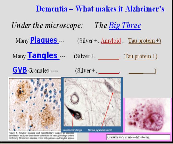 | 1. The Alzheimer Plaques (always Round in profile but variable in diameter) are, by In Situ DNA hybridization studies derived from Rounded Cystic forms of the Borrelia Spirochete. 2. The Alzheimer Neurofibrillary Tangles ( fibrils inside of diseased nerve cells) are derived from Abnormal Tau protein material. 3. The Alzheimer GVB ( Granular/Vacuolar bodies) are dot-like structures inside of diseased Nerves -- DNA of the Borrelia spirochetes binds to the GVB. |